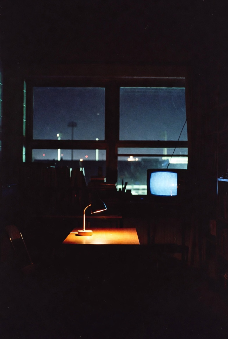 On the same desk, I plug in a small lamp. When I turn it on, it throws a low amber circle across the desktop. I switch off the overhead light. The room goes dim. The television flickers in the corner. The lamp holds its small pool of warmth.